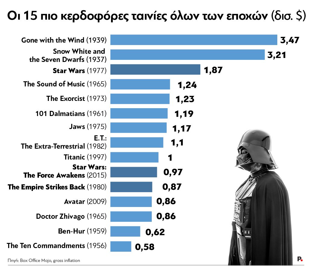 Αλλωστε, στη λίστα με τις 15 πιο κερδοφόρες ταινίες όλων των εποχών βρίσκονται άλλα δύο επεισόδια της κινηματογραφικής σειράς, το «Force Awakens» (2015) με 0,97 δισ. δολάρια και το «Empire Strikes Back» (1980) με 0,87 δισ. δολάρια.
