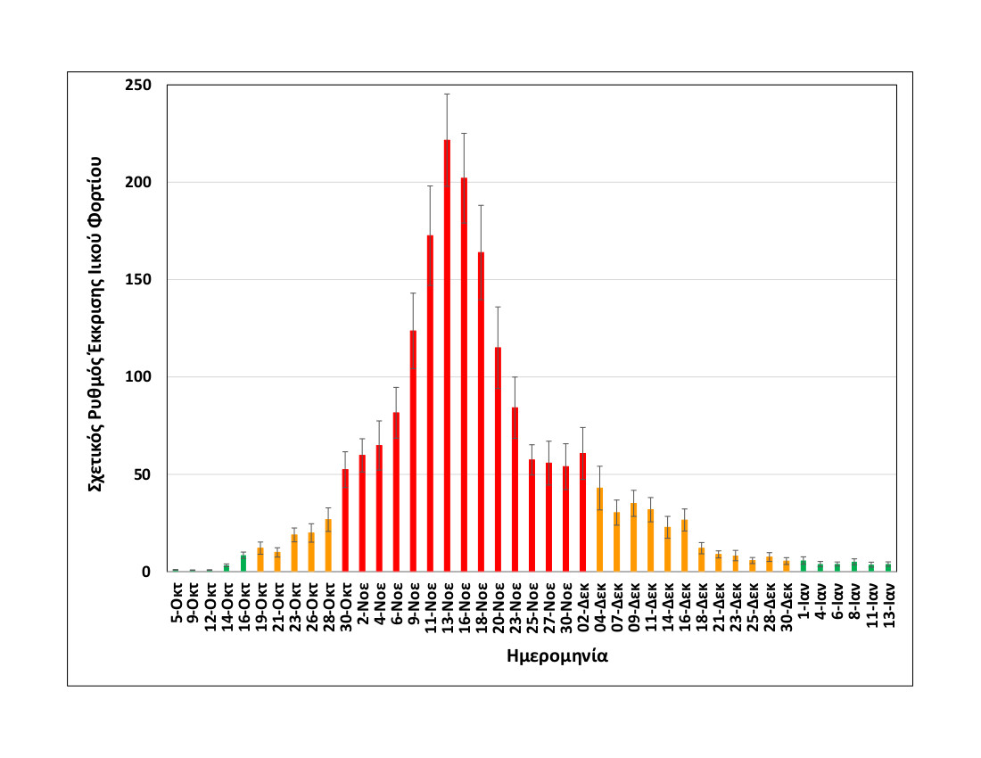 Στο συνημμένο διάγραμμα, που δημοσιεύει το ΑΠΕ-ΜΠΕ, οι ημέρες των δειγματοληψιών που καταγράφονται με κόκκινο χρώμα αντιστοιχούν σε περισσότερα από 500 κρούσματα –όπως ανακοινώθηκαν τις αντίστοιχες ημέρες από τον ΕΟΔΥ– οι μέρες που καταγράφονται με πορτοκαλί σε 100-400 κρούσματα και οι μέρες που καταγράφονται με πράσινο σε λιγότερα από 100 κρούσματα.