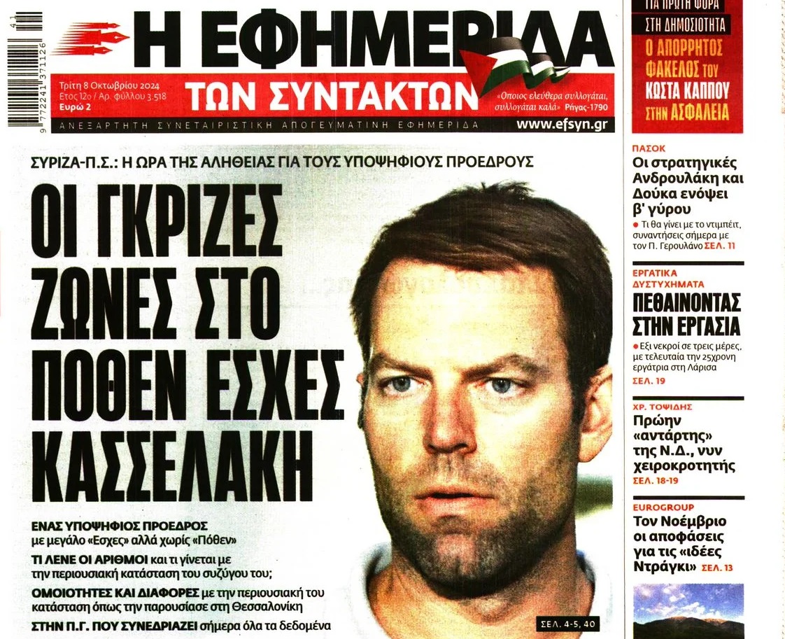 Η αντίδραση Κασσελάκη για το πρωτοσέλιδο (δείτε το επάνω) της «Εφημερίδας των Συντακτών» ήρθε διά του διευθυντή του Γραφείου του, Μανώλη Καπνισάκη, ο οποίος στη σχετική ανακοίνωσή του σημειώνει μεταξύ άλλων ότι ο Στέφανος Κασσελάκης αναγκάζεται πλέον να εξετάσει σοβαρά το ενδεχόμενο προσφυγής στη Δικαιοσύνη για την προάσπιση των δικαιωμάτων του.