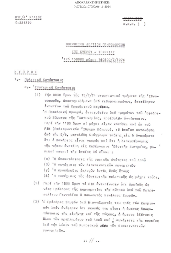 Πενήντα χρόνια μετά, σε μια προσπάθεια να συμβάλει στην καλύτερη κατανόηση των εξελίξεων και συνθηκών του πραξικοπήματος κατά του Αρχιεπισκόπου Μακαρίου και της τουρκικής εισβολής, η Εθνική Υπηρεσία Πληροφοριών (ΕΥΠ) δίνει στη δημοσιότητα τα 58 δελτία που συνέταξαν τους δύο αυτούς δραματικούς μήνες τα αρμόδια στελέχη της ΚΥΠ, όπως ονομαζόταν τότε η υπηρεσία.