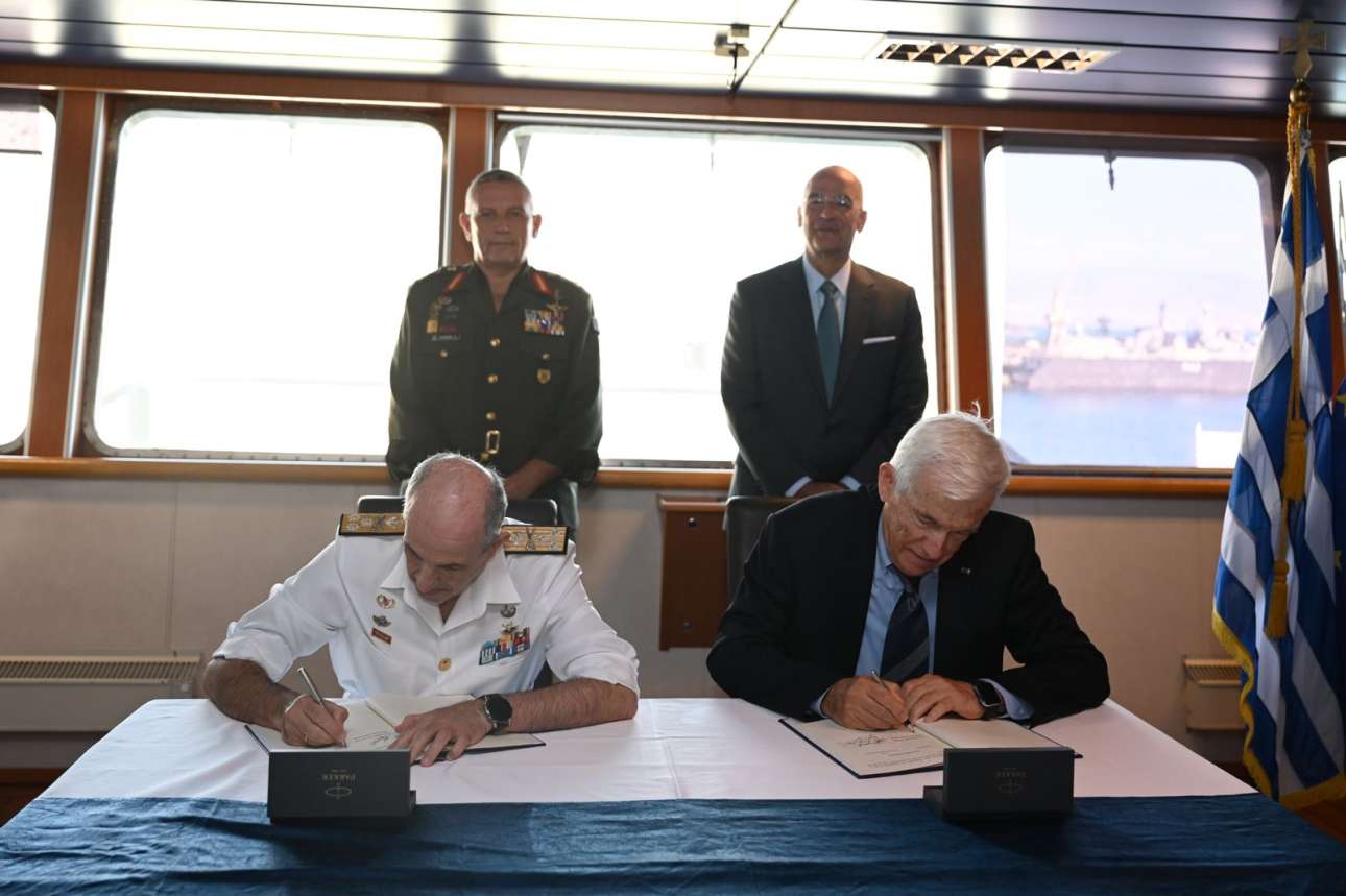 Στην τελετή υπογραφής της παράδοσης του «Περσέα» στη δύναμη του Πολεμικού Ναυτικού, η οποία πραγματοποιήθηκε στις εγκαταστάσεις του Ναυστάθμου Σαλαμίνος. παρέστη ο υπουργός Εθνικής Αμυνας, Νίκος Δένδιας, συνοδευόμενος από τον Αρχηγό ΓΕΕΘΑ Στρατηγό Κωνσταντίνο Φλώρο και τον Αρχηγό ΓΕΝ Αντιναύαρχο Ιωάννη Δρυμούση ΠΝ.
