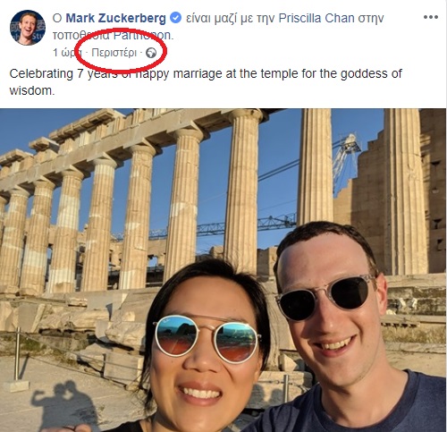 Με μία ανάρτησή του –πού αλλού;– στο Facebook, ο Μαρκ Ζάκερμπεργκ, ιδρυτής του τεχνολογικού κολοσσού, γνωστοποίησε το πρωί της Παρασκευής ότι βρίσκεται στην Αθήνα και επισκέφτηκε τον Παρθενώνα μαζί με τη σύζυγό του, Πρισίλα Τσαν.