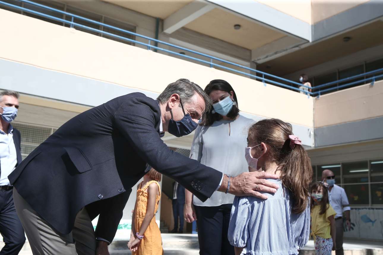 Μετά τον αγιασμό και αφού ευχήθηκε καλή σχολική χρονιά και με υγεία, ο κ. Μητσοτάκης, απευθυνόμενος στους μαθητές του σχολείου, είπε: «Φέτος πρέπει να κάνουμε όλοι μια προσπάθεια παραπάνω. Να φροντίσουμε τους γονείς μας, τους παππούδες και τις γιαγιάδες μας. Θαυμάζω το γεγονός ότι όλοι δείχνετε αυτή τη συνέπεια και θα κάνετε αυτό που είναι σωστό». «Και πρέπει να σας πω ότι είναι μια στιγμή που επιτρέπεται ο ένας να αντιγράφει τον άλλον», προσέθεσε με νόημα ο κ. Μητσοτάκης, ζητώντας από τα παιδιά να… αντιγράψουν το να φοράς μάσκα, το να πλένεις τα χέρια σου και το να κρατάς αποστάσεις.