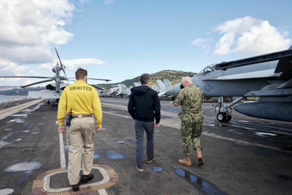 «Με πολύ μεγάλη χαρά βρίσκομαι, σήμερα, στη Σούδα επισκεπτόμενος το αμερικανικό αεροπλανοφόρο USS Dwight D. Eisenhower. H στρατιωτική συνεργασία Ηνωμένων Πολιτειών – Ελλάδος βρίσκεται σε εξαιρετικά υψηλά επίπεδα.