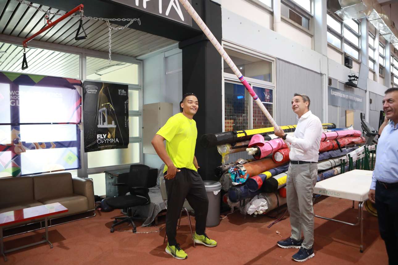 Στο προπονητήριο του ΟΑΚΑ, ο Πρωθυπουργός «δοκίμασε» με ένα γρήγορο run το ταρτάν, όπως και το κοντάρι του επί κοντώ στο σημείο της προπόνησης του «χάλκινου» στο τελευταίο παγκόσμιο πρωτάθλημα κλειστού στίβου, Εμμανουήλ Καραλή.