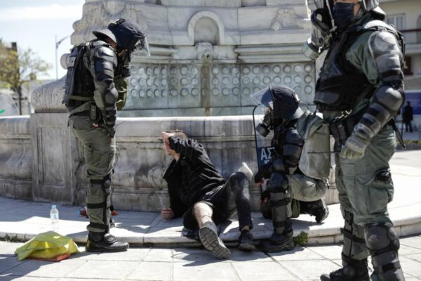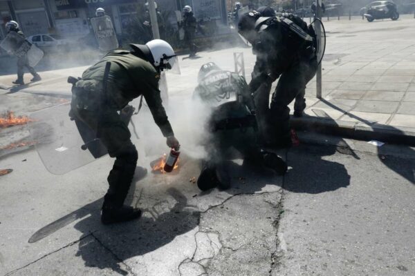 Ο 26χρονος τραυματίστηκε από ρίψη μολότοφ την ώρα της σύλληψης. Από τη μολότοφ που πέταξαν οι διαδηλωτές, πήρε φωτιά το δεξί πόδι του, με τους άνδρες των ΜΑΤ να χρησιμοποιούν αντιπυρική κουβέρτα και πυροσβεστήρα για να τη σβήσουν.