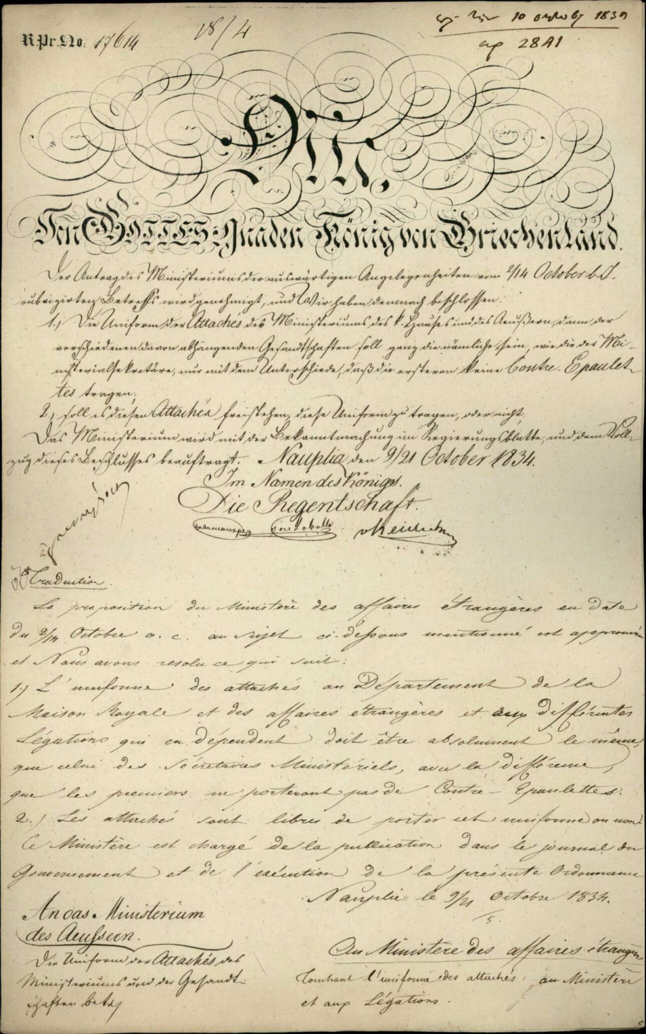 Η έκθεση «παρακολουθεί» την πορεία της αναγνώρισης του νέου ελληνικού κράτους, καλύπτοντας την περίοδο έως και το 1840. Εχει εξαιρετικό ενδιαφέρον το γεγονός ότι η Ελλάδα είχε συνάψει σχέσεις με το Βασίλειο των Δυο Σικελιών, με τα Κράτη της Γερμανικής Συνομοσπονδίας, με τα Παπικά Κράτη, με το Βασίλειο της Σουηδίας και της Νορβηγίας – τα ονόματα που έφεραν τότε τα αυτόνομα αυτά κράτη. Οπως και η ιδιαιτερότητα της Ελλάδας – σε αντίθεση με άλλα κράτη της εποχής – που χρησιμοποιεί το παλαιό, ιουλιανό ημερολόγιο. Στις περιγραφές των εγγράφων, όλες οι ημερομηνίες αναγράφονται με βάση και τα δυο ημερολόγια.