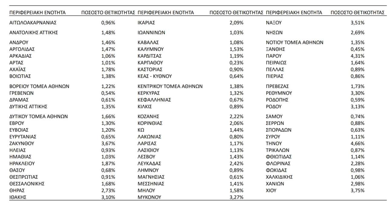 Ακολουθεί η Ζάκυνθος με 3,67%, η Νάξος με 3,51%, το Ρέθυμνο με 3,3%, η Μύκονος με 3,27% και η Ρόδος με 3,13%. Η Σαντορίνη έπεσε στο 2,37%