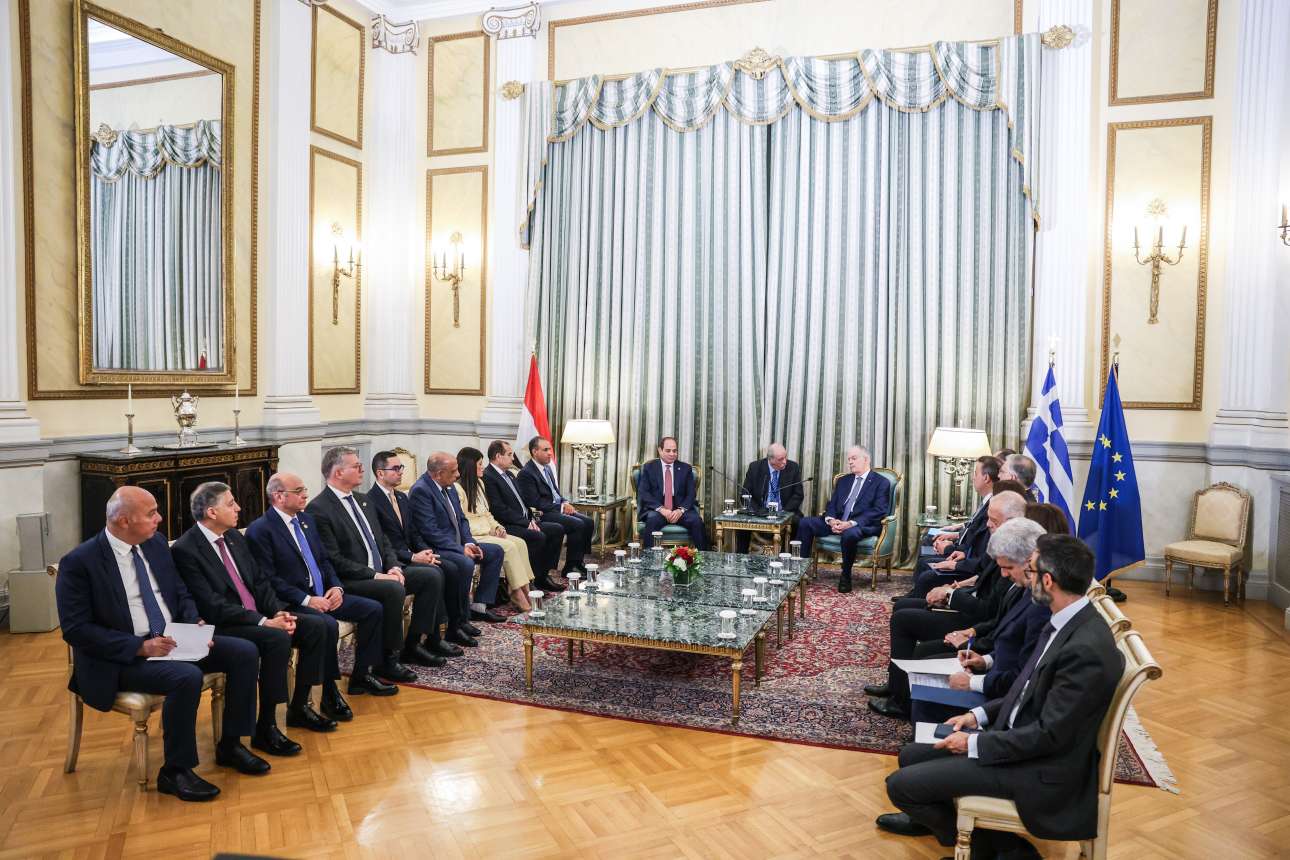 Πριν από τη συνάντηση με τον Πρωθυπουργό, ο Αμπντέλ Φατάχ Αλ-Σίσι έγινε δεκτός στο Προεδρικό Μέγαρο από τον Πρόεδρο της Δημοκρατίας, Κώστα Τασούλα.