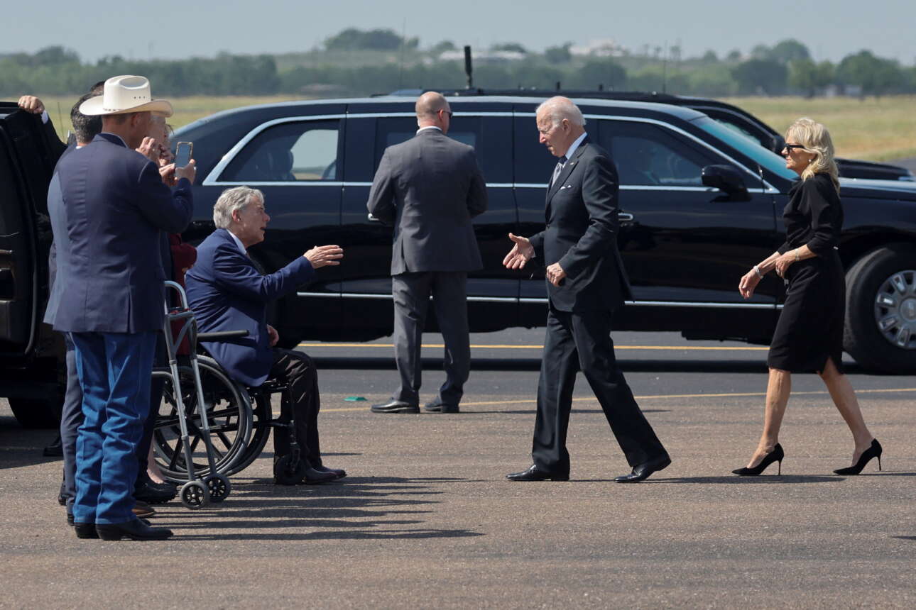 Στο δημοτικό σχολείο Ρομπ του Ουβάλντε στο Τέξας έφτασε την Κυριακή το ζεύγος Μπάιντεν, πέντε ημέρες μετά το μακελειό που άφησε νεκρά 19 παιδιά και δύο δασκάλες και επανέφερε τη συζήτηση περί οπλοκατοχής στις ΗΠΑ.