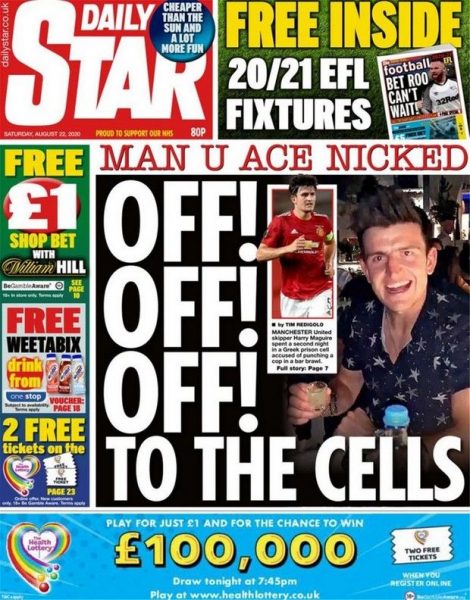Φωτογραφίες του Μαγκουάιρ στην Μύκονο κατακλύζουν τα σημερινά πρωτοσέλιδα του βρετανικού Τύπου συνοδεία ενός μεγάλου ερωτηματικού για το πώς «ένας σοβαρός επαγγελματίας, ο άσος της Μάντσεστερ Γιουνάιτεντ επέδειξε τέτοια συμπεριφορά καταλήγοντας στην φυλακή».