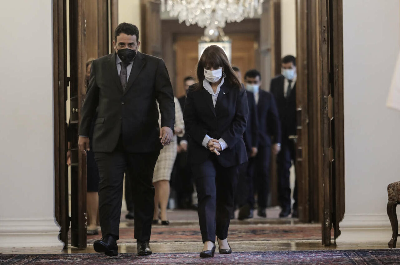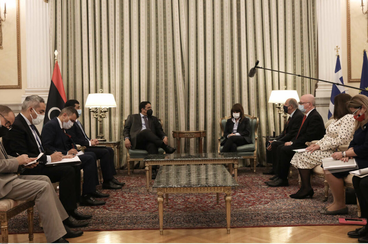 Αμέσως μετά τη συνάντησή του με τον Πρωθυπουργό, ο πρόεδρος του Προεδρικού Συμβουλίου της Λιβύης, Μοχάμεντ αλ Μένφι, έγινε δεκτός από την Πρόεδρο της Δημοκρατίας, Κατερίνα Σακελλαροπούλου, στο Προεδρικό Μέγαρο.