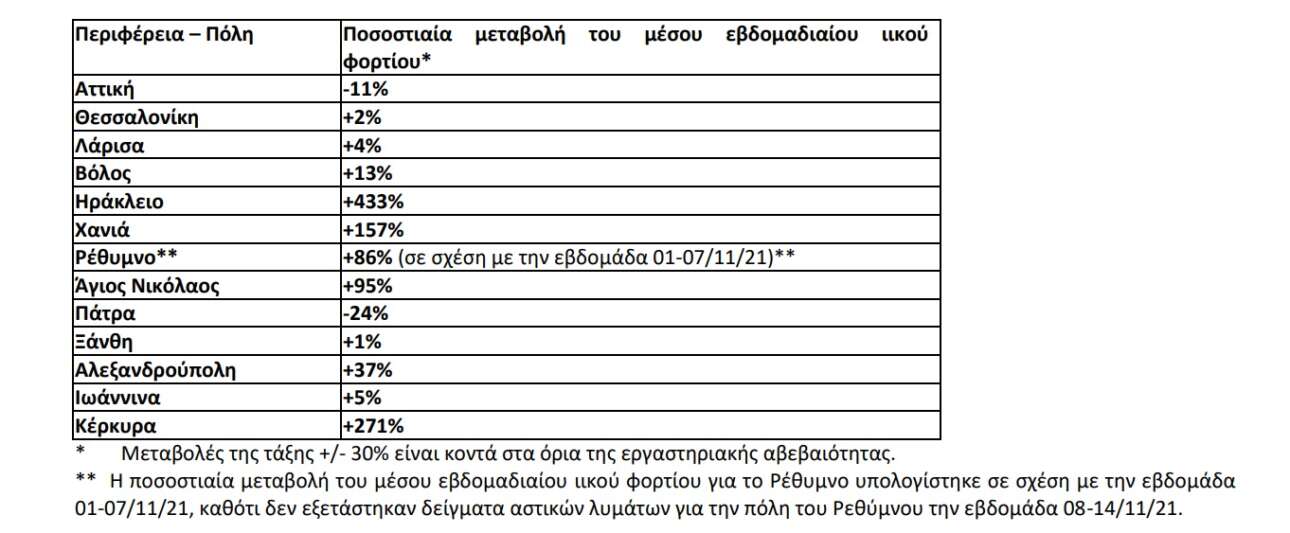Αύξηση του μέσου εβδομαδιαίου ιικού φορτίου των αστικών λυμάτων παρατηρήθηκε στην Αλεξανδρούπολη (37%), στο Ρέθυμνο (86%), τον Αγιο Νικόλαο (95%), τα Χανιά (+157%), στην Κέρκυρα (271%) και στο Ηράκλειο (433%).