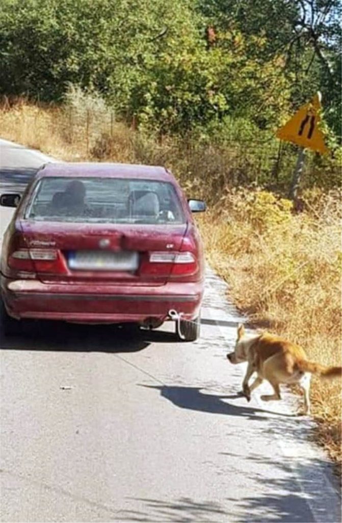 Σύμφωνα με μαρτυρίες, το άτυχο σκυλί πάσχιζε να τρέξει στην ταχύτητα του αυτοκινήτου και σε ορισμένα σημεία της διαδρομής σερνόταν πίσω του.