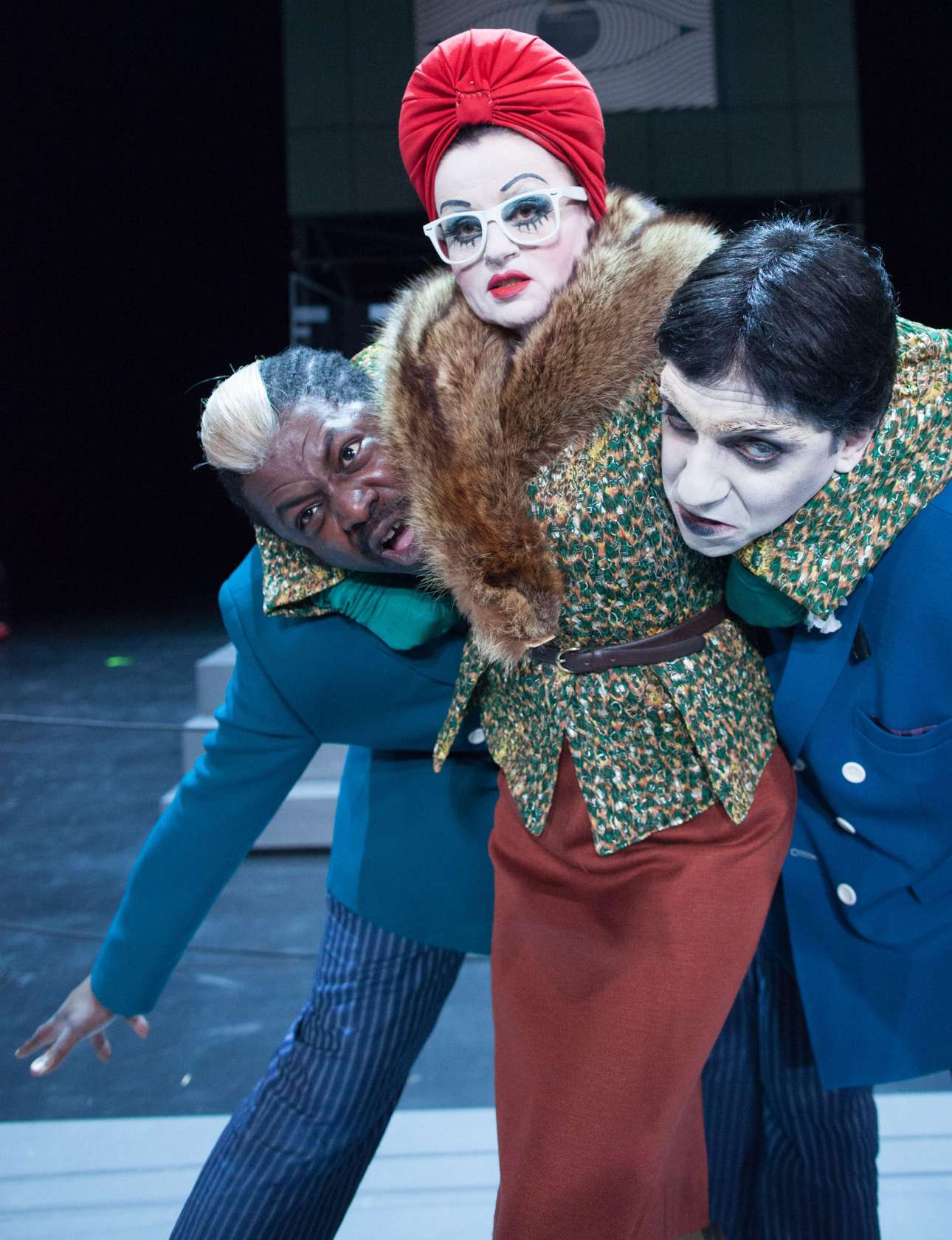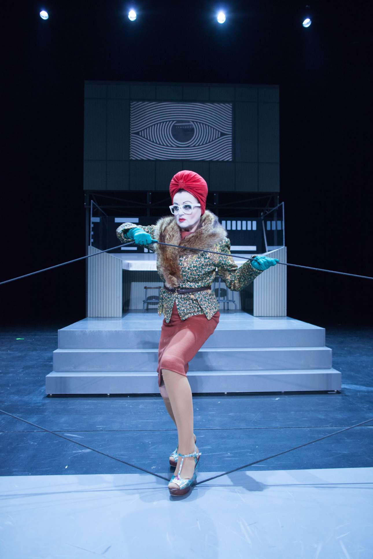 Φορά προσθετικά στοιχεία που ενισχύουν την αδύνατη φιγούρα της. Τραγουδά τη «Μπαλάντα της σεξουαλικής σκλαβιάς» με σπαρακτικό τρόπο. Αλλά στην ψυχή δεν έχει τίποτα όμορφο. Η φωνή της ακούγεται σκληρή κι όσο η παράσταση προχωρά οδηγείται στην απόλυτη κατάρρευση. Είναι βρεγμένη ως το κόκκαλο από το αλκοόλ και αδίστακτη στον χαρακτήρα. Η Καρυοφυλλιά Καραμπέτη ερμηνεύει την Kυρία Πίτσαμ στην «Οπερα της Πεντάρας» των Μπρεχτ- Βάιλ που σκηνοθετεί ο Γιάννης Χουβαρδάς στο Θέατρο Παλλάς.