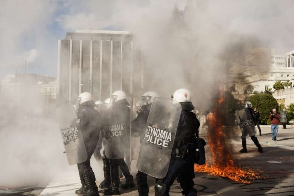 Στη συνέχεια η ένταση μεταφέρθηκε στην κάτω πλευρά της πλατείας Συντάγματος όπου ομάδα ΔΙΑΣ δέχθηκε επίθεση με πέτρες από αγνώστους στην οδό Ερμού, ενώ κουκουλοφόροι έβαζαν φωτιές σε κάδους απορριμμάτων στην συμβολή των οδών Μητροπόλεως και Φιλελλήνων, προκαλώντας παράλληλα υλικές ζημίες σε καταστήματα.