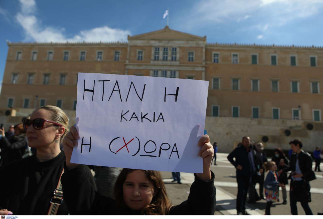 Οι διαδηλωτές, κάθε ηλικίας, κρατούσαν δεκάδες πανό με συνθήματα διαμαρτυρίας, όπως το γνωστό πλέον «φταίει η κακιά η (χ)ώρα», στο οποίο αναφέρθηκε και ο Κυριάκος Μητσοτάκης, στην ανάρτησή του στο Facebook.