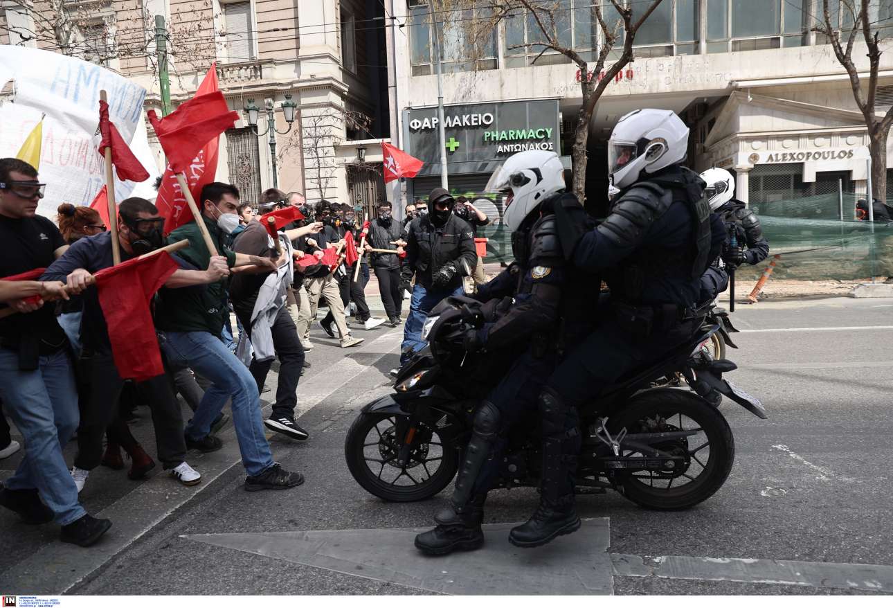Σύμφωνα με την ΕΛ.ΑΣ, μια ομάδα πάνω από 200 άτομα που βρίσκονταν μέσα και στην περίμετρο της συγκέντρωσης και στη συνέχεια της πορείας, εκτόξευσαν μάρμαρα, πέτρες και βόμβες μολότοφ εναντίον των αστυνομικών δυνάμεων.