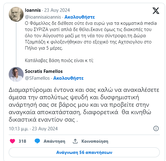 Την ίδια στιγμή ερχόταν στη δημοσιότητα ένα περιστατικό που φάνηκε να βεβαιώνει τα λεγόμενα της βουλευτή. Ο λόγος για την ανάρτηση ενός ανώνυμου λογαριασμού στο X, του «Ιoannis» (@ioannisaioannis), ο οποίος έβαλε στο στόχαστρο τον Σωκράτη Φάμελλο, εμφανίζοντας τον να έχει ανοιχτούς διαύλους επικοινωνίας με τη Νέα Αριστερά.