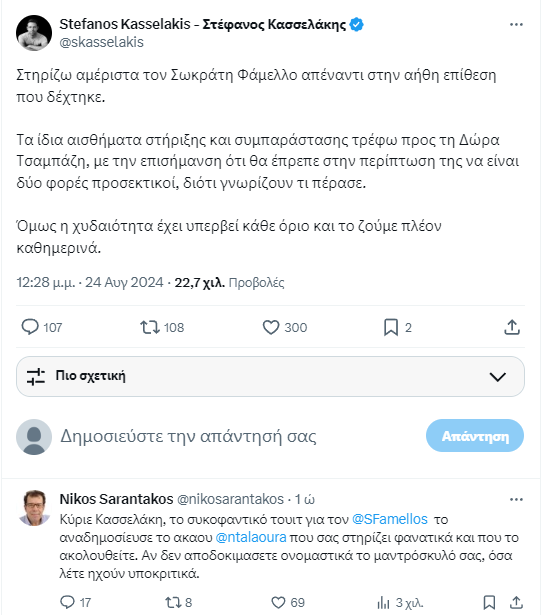 «Η χυδαιότητα έχει υπερβεί κάθε όριο και το ζούμε πλέον καθημερινά» προσέθεσε ο Στέφανος Κασσελάκης στην ανάρτησή του, με σχολιαστές να του επισημαίνουν, πάντως, πως το tweet του «Ιoannis» κοινοποιήθηκε –μεταξύ άλλων– από τον γνωστό ανώνυμο λογαριασμό «Πεν Νταλαούρα», ο οποίος στηρίζει φανατικά την ηγεσία.