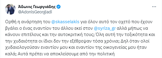 «Ορθή η ανάρτηση του Στέφανου Κασσελάκη για όλον αυτό τον οχετό που έχουν βγάλει ο ένας εναντίον του άλλου εκεί στον ΣΥΡΙΖΑ, αλλά μήπως να κάνουν επιτέλους και την αυτοκριτική τους; Ολη αυτή την τοξικότητα και την χυδαιότητα οι ίδιοι δεν την εξέθρεψαν τόσα χρόνια; Δηλαδή όταν ολοί χυδαιολογούσαν εναντίον μου και εναντίον της οικογενείας μου ήταν καλά; Αυτά πρέπει να αποκλείσουμε από την πολιτική».