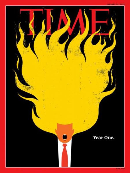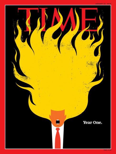 Και η επιλογή είναι, όντως, δύσκολη καθώς από την τελική λίστα παρελαύνει αρκετές φορές ο Ντόναλντ Τραμπ σε διάφορες… παραλλαγές: να προσπαθεί να κολυμπήσει σε ένα πλημμυρισμένο Οβάλ Γραφείο (σε εξώφυλλο του ΤΙΜΕ), να αποπειράται να βγει μέσα από μια μαύρη τρύπα (σε εξώφυλλο του New Yorker) ή να απεικονίζεται με τα μαλλιά του να φλέγονται (ΤΙΜΕ ξανά).