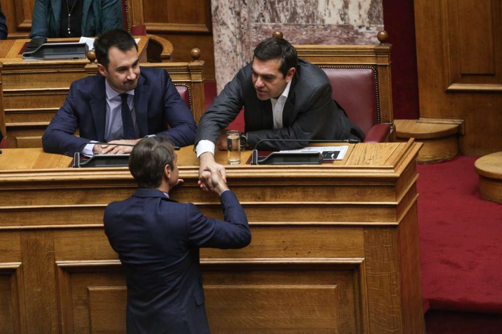 Κάνοντας ένα… διάλειμμα στην προεκλογική τους αντιπαράθεση, οι κ.κ. Τσίπρας και Μητσοτάκης αντήλλαξαν χειραψία υπό το βλέμμα του αμήχανου υπουργού Εσωτερικών Αλέξη Χαρίτση και της υπουργού Προστασίας του Πολίτη Ολγας Γεροβασίλη που «ευτυχώς» δεν δέχθηκε ερώτηση για την επίσκεψη του Ρουβίκωνα στην κατοικία του αμερικανού πρεσβευτή.