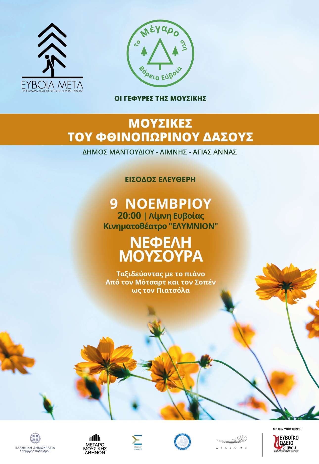 Με το ρεσιτάλ της διεθνώς καταξιωμένης σολίστ του πιάνου Νεφέλης Μούσουρα ολοκληρώνονται το Σάββατο 9 Νοεμβρίου στη Λίμνη Ευβοίας (Κινηματοθέατρο «Ελύμνιον», ώρα 8:00 μ.μ.) οι φετινές Μουσικές του φθινοπωρινού δάσους, το φεστιβάλ εκδηλώσεων που διοργανώνει το Μέγαρο Μουσικής Αθηνών στη Βόρεια Εύβοια, με ελεύθερη είσοδο για το κοινό.