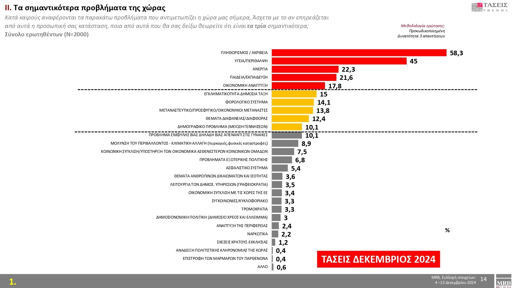 Οπως λένε οι πολίτες, τα τρία σημαντικότερα προβλήματα της χώρας είναι: πληθωρισμός/ακρίβεια με 58,3%, υγεία/περίθαλψη με 45% και ανεργία με 22,3%.