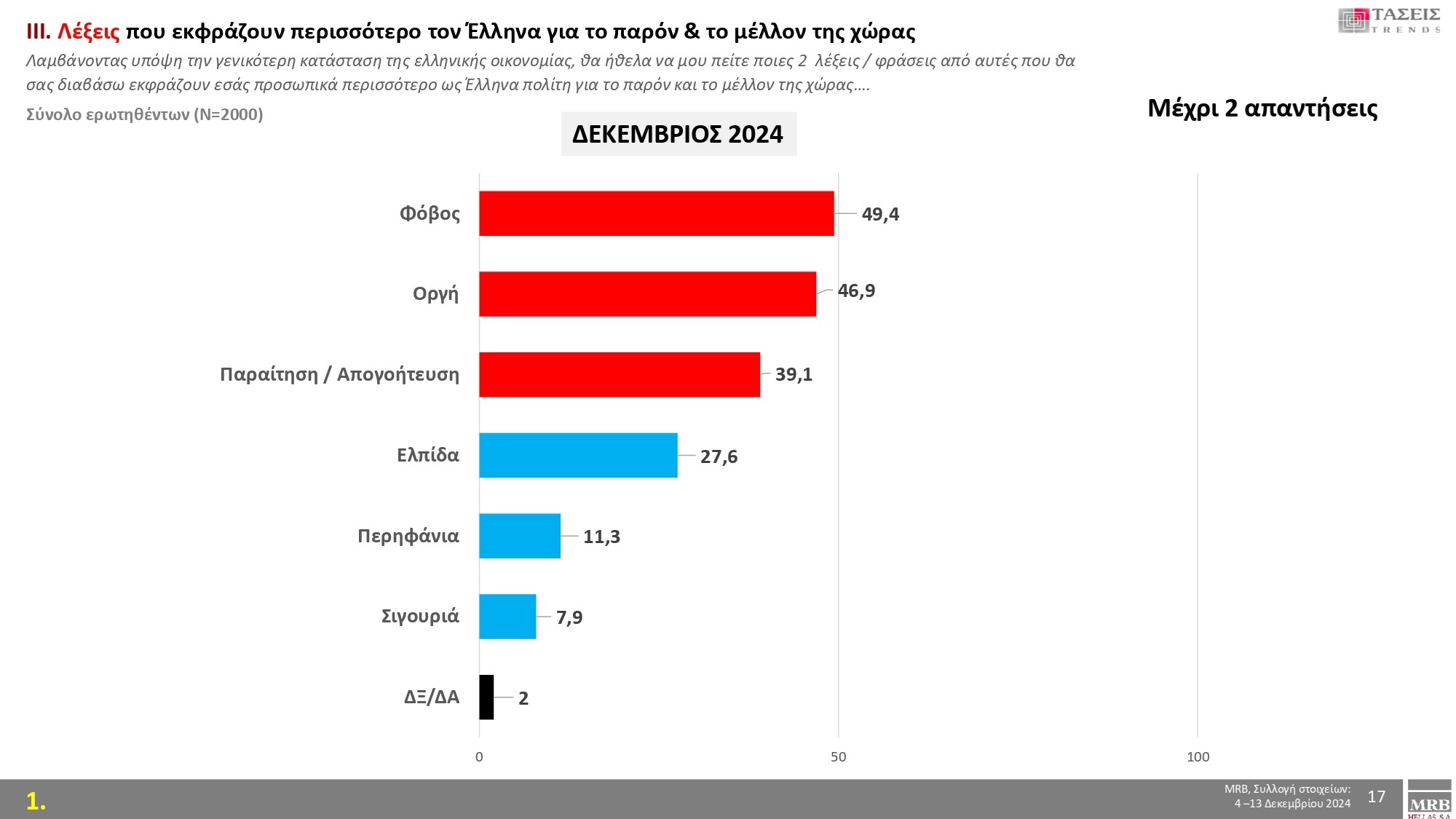 Στις λέξεις που εκφράζουν περισσότερο τον Ελληνα σήμερα για το παρόν και το μέλλον χώρας, η λέξη «φόβος» φιγουράρει πρώτη με 49,4% και έπονται η «οργή» με 46,9% και η «παραίτηση/απογοήτευση» με 39,1 %.