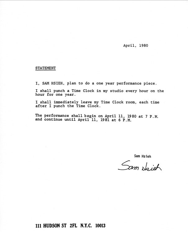 Aρχισε την performance στο στούντιο του στη Νέα Υόρκη πριν από ακριβώς 36 χρόνια, στις 11 Απριλίου του 1980, στις 7 το πρωί. Ξύρισε το κεφάλι του και φωτογράφιζε τον εαυτό του κάθε φορά που χτυπούσε την κάρτα –απέτυχε να το κάνει εγκαίρως μόνο 133 φορές σε αυτές τις 365 μέρες των 24 ωρών… Απλά το ξυπνητήρι με τον εκκωφαντικό ήχο που χρησιμοποιούσε δεν μπόρεσε να τον κάνει να σηκωθεί από το κρεβάτι του. Ενας χρόνος με το αίσθημα πως είσαι μετέωρος, πως ορίζεσαι από την «ζωής ή θανάτου» ανάγκη να χτυπήσεις την κάρτα στο ειδικό ρολόι. Οταν ρωτήθηκε ο Hsieh αν αυτό που ήθελε να κάνει ήταν ένα σχόλιο πολιτικό για την εργατική τάξη, έσπευσε να ξεκαθαρίσει πως δεν θεωρεί τον εαυτό του πολιτικό καλλιτέχνη «αν και οι άνθρωποι έχουν την ελευθερία να ερμηνεύσουν το έργο μου από μια πολιτική σκοπιά. Εμένα όμως, με ενδιαφέρουν οι παγκόσμιες συνθήκες της ανθρώπινης ζωής».