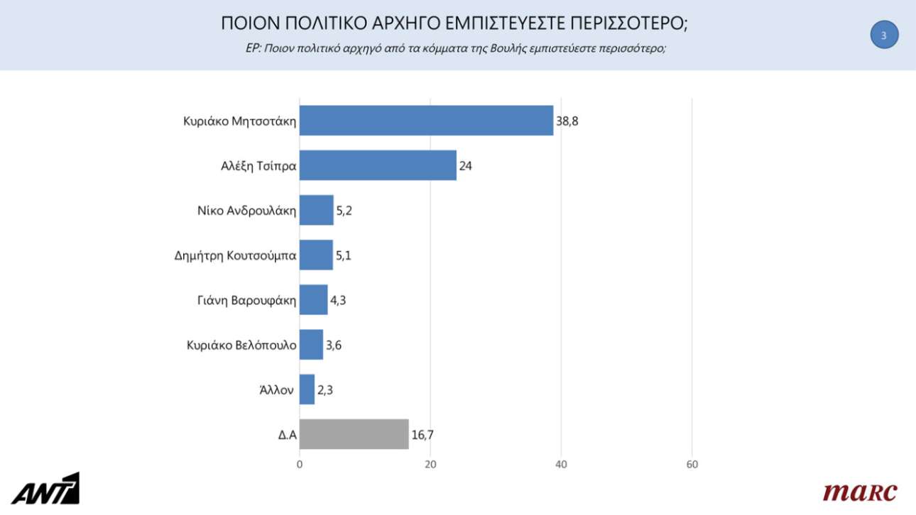 Στην παράσταση νίκης η ΝΔ έχει ένα μεγάλο προβάδισμα 65,5% έναντι 20,5% του ΣΥΡΙΖΑ, ενώ και στο ερώτημα ποιον πολιτικό αρχηγό εμπιστεύεστε περισσότερο ο Κυριάκος Μητσοτάκης προηγείται με 38,8% έναντι 24% του Αλέξη Τσίπρα.