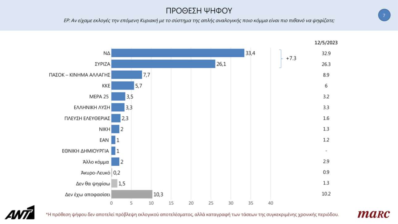 Στην πρόθεση ψήφου, συγκεκριμένα, η ΝΔ λαμβάνει ποσοστό 33,4%, ο ΣΥΡΙΖΑ 26,1%, το ΠΑΣΟΚ-ΚΙΝΑΛ 7,7%, το ΚΚΕ 5,7%, η Ελληνική Λύση 3,3% και το ΜέΡΑ25 3,5%.