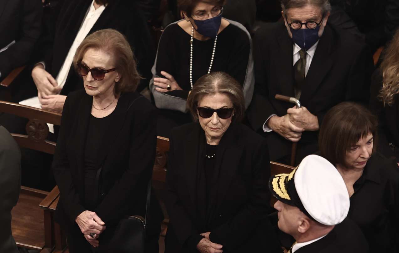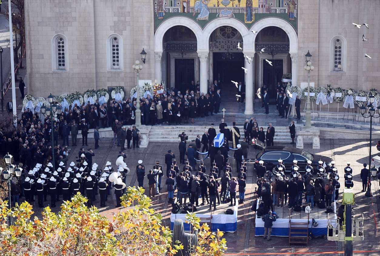 Το φέρετρο με τη σορό του Κώστα Σημίτη έφθασε στη Μητρόπολη σκεπασμένο με την ελληνική σημαία. Εκεί περίμεναν η σύζυγός του, Δάφνη, και οι δύο κόρες τους.