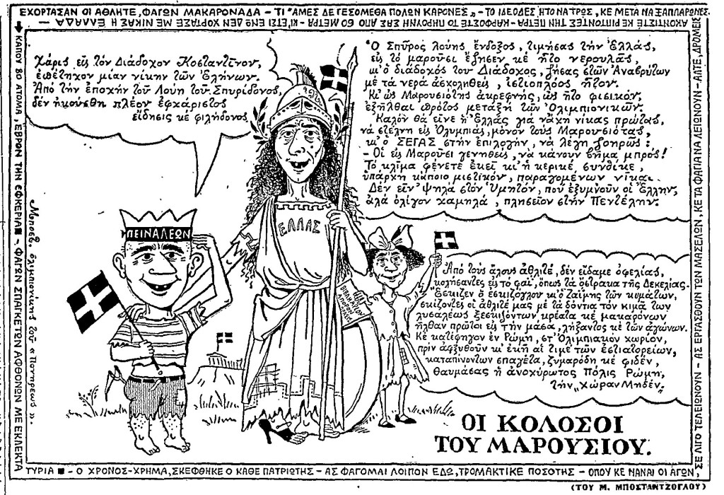 Χρησιμοποιώντας του ήρωές του, τον Πειναλέοντα και την Ανεργίτσα, ο Μποστ έκανε έναν κραυγαλέο –και ως εκ τούτου γεμάτο ειρωνεία– παραλληλισμό με τη νίκη του Σπύρου Λούη το 1896, βρίσκοντας ως κοινό στοιχείο τη σχέση των δυο ολυμπιονικών με το… Μαρούσι (ο Κωνσταντίνος είχε σπουδάσει στα Ανάβρυτα) και προτείνοντας να στέλνονται στις Ολυμπιάδες μόνο Μαρουσιώτες….