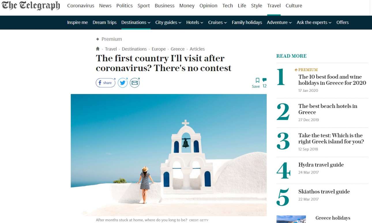 Με ένα εγκωμιαστικό και ελπιδοφόρο άρθρο για την Ελλάδα, η βρετανική Telegraph αναφέρει ότι η χώρα μας θα είναι ο πρώτος προορισμός διακοπών μόλις αρθούν τα περιοριστικά μέτρα του κορονοϊού.
