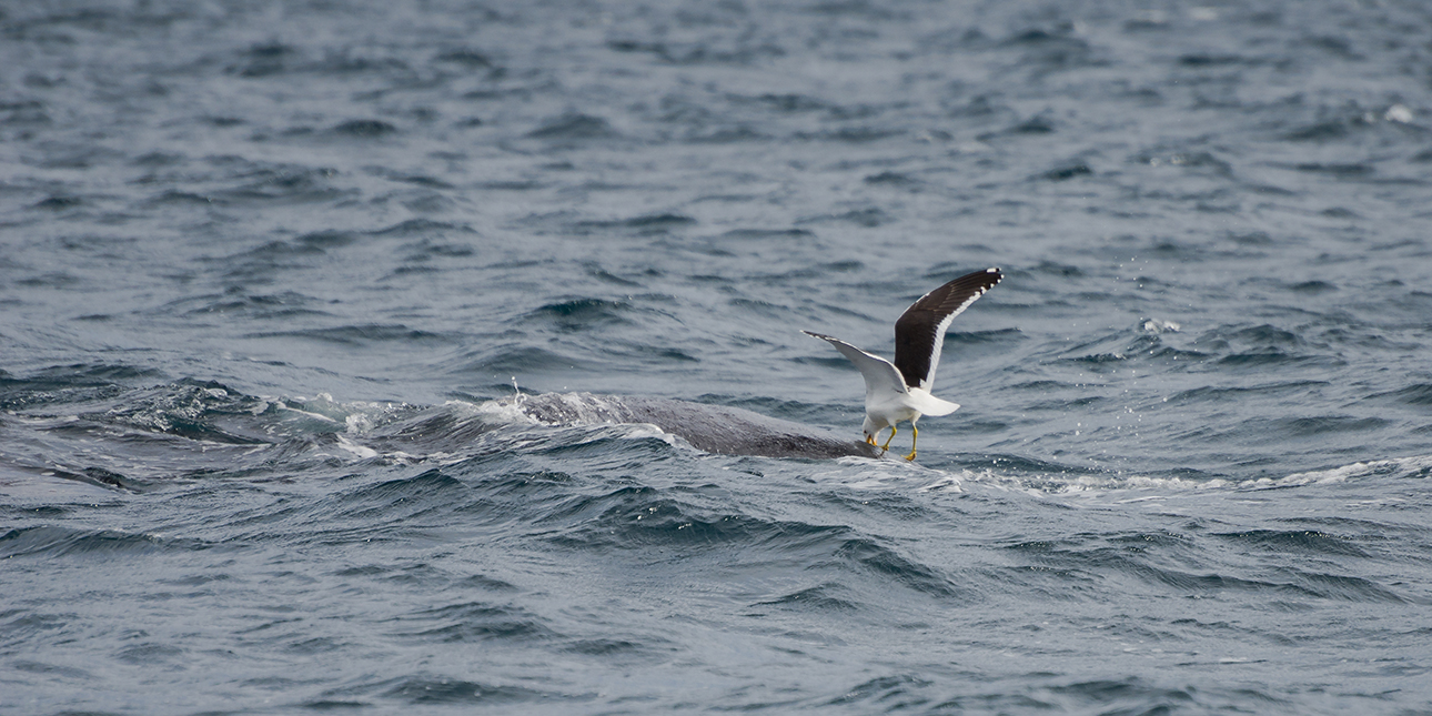 Τη στιγμή όμως που μία από τις φάλαινες, ειδικά μία από τα μικρά, ανεβεί στην επιφάνεια για να πάρει ανάσα, οι γλάροι την τσιμπολογούν ανελέητα, καταβροχθίζοντας όσο περισσότερο δέρμα και λίπος καταφέρνουν να αποσπάσουν από την πλάτη της.