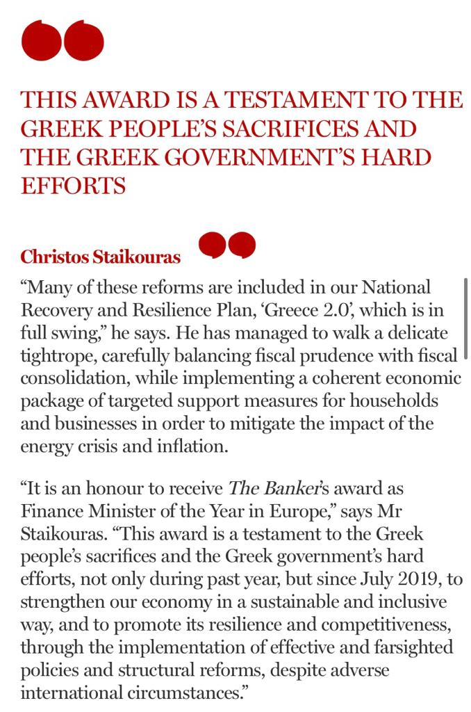 «Η σημερινή βράβευσή μου ως υπουργός Οικονομικών της Χρονιάς 2023 για την Ευρώπη, από το περιοδικό “The Banker” του ομίλου των “Financial Times”, αποτελεί ξεχωριστή τιμή.