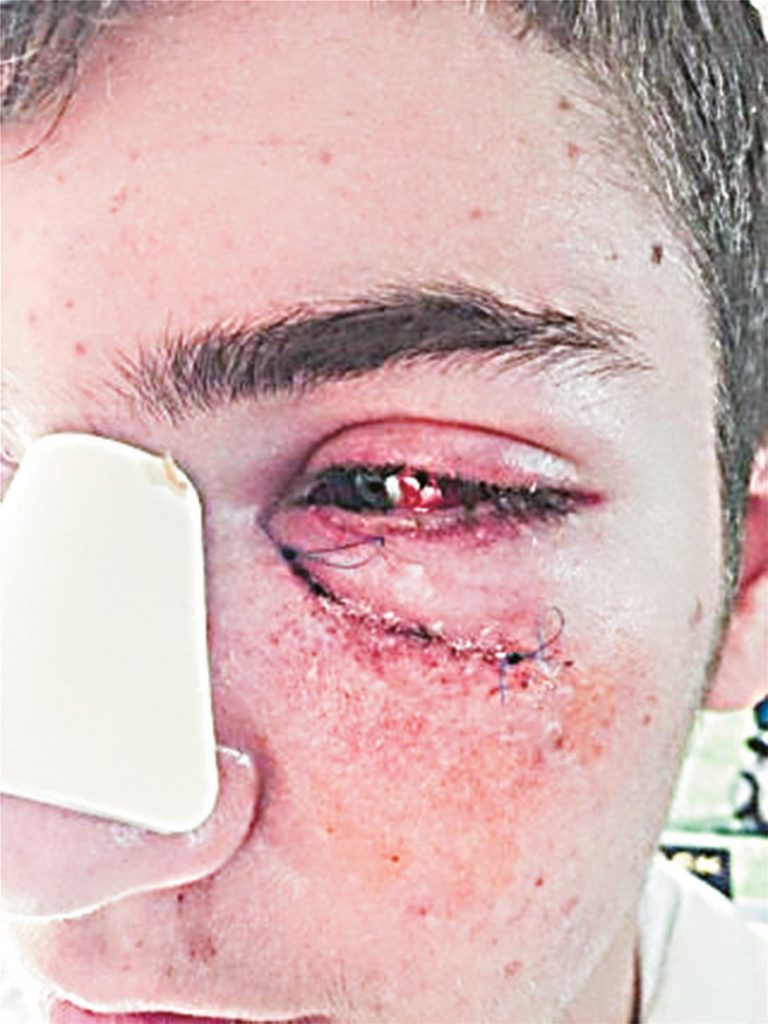 Η εικόνα του προσώπου του μετά την επίθεση που δέχθηκε τρομακτική: με νάρθηκα στη μύτη και εμφανή τα ράμματα για να κλείσει το βαθύ τραύμα που του προκάλεσαν οι δράστες της επίθεσης κάτω από αριστερό του μάτι.