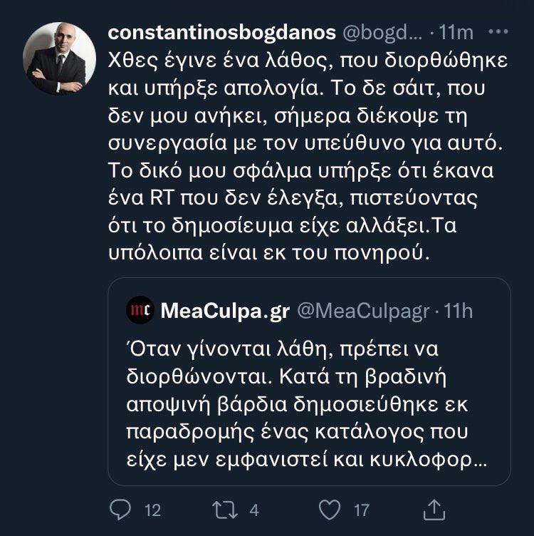 Ο δε κ. Μπογδάνος, σε νεότερη ανάρτησή του, το πρωί της Τετάρτης, ανέφερε ότι ο υπεύθυνος για το λάθος στο συγκεκριμένο site απομακρύνθηκε, ότι το site δεν του ανήκει και ότι το δικό του λάθος ήταν ότι αναπαρήγαγε το κείμενο πιστεύοντας ότι το δημοσίευμα είχε αλλάξει. Ισχυρίστηκε δηλαδή ότι όταν έκανε την επίμαχη δημοσίευση, στις 19:50 της Τρίτης, νόμιζε πως είχε αφαιρεθεί ο κατάλογος με τα ονόματα μικρών παιδιών που στοχοποιούνταν.
