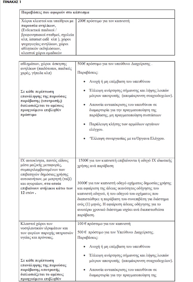 Σύμφωνα με την ΚΥΑ το κατώτερο πρόστιμο των 50 ευρώ αυξάνεται στα 100 ευρώ και ισχύει για κάθε παράβαση σε όλους τους κλειστούς χώρους υγειονομικού ενδιαφέροντος, σε όλους τους κλειστούς χώρους εργασίας, σε όλα τα μέσα μαζικής μεταφοράς, τους σταθμούς μεταφορικών μέσων και επιβατικών σταθμών λιμένων, τα αεροδρόμια εκτός των ειδικών χώρων καπνιστών, τους δημόσιους χώρους εργασίας καθώς και αναμονής δημοσίων υπηρεσιών.