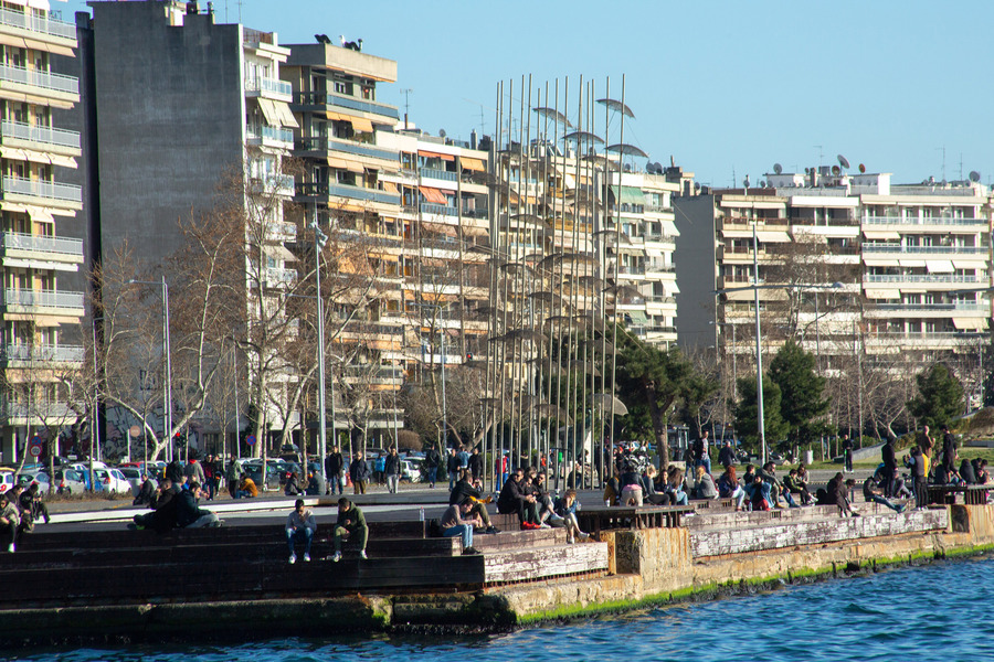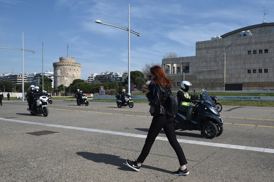 Αστυνομικοί της ΕΛ.ΑΣ και της Δημοτικής Αστυνομίας με περιπολικά και μοτοσυκλέτες περιπολούν από το λιμάνι της πόλης έως το Μέγαρο Μουσικής, σε όλο το παραλιακό μέτωπο μήκους περίπου πέντε χλμ, που υπό κανονικές συνθήκες είναι η επιλογή χιλιάδων πολιτών καθημερινά για τη βόλτα τους και την άθλησή τους.