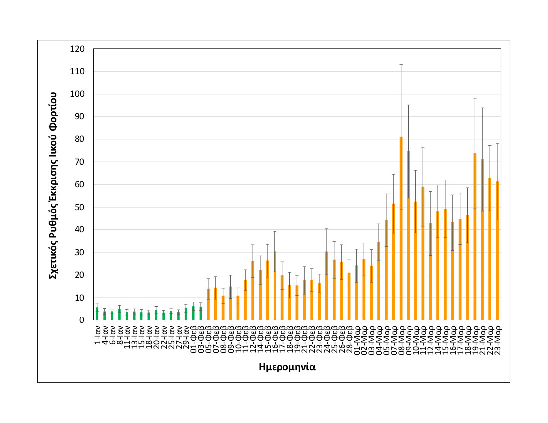 -Μειωμένη κατά 14% σε σχέση με τη μέση τιμή των δύο αμέσως, προηγούμενων μετρήσεων, δηλαδή της Παρασκευής 19/3 και της Κυριακής 21/3.
