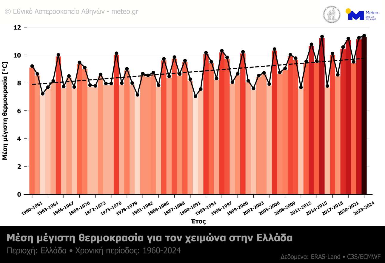 Η μέση μέγιστη θερμοκρασία στην Ελλάδα από το 1960 μέχρι και το 2024 για την περίοδο του χειμώνα παρουσιάζει άνοδο κατά 1,8 °C.