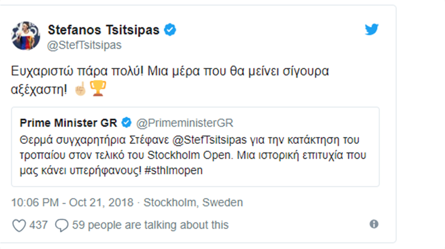 «Θερμά συγχαρητήρια Στέφανε για την κατάκτηση του τροπαίου στον τελικό του Stockholm Open. Μια ιστορική επιτυχία που μας κάνει υπερήφανους» έγραψε ο πρωθυπουργός.