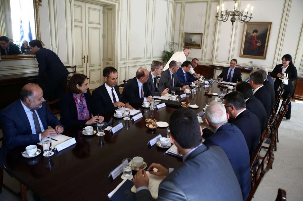 Ο Πρωθυπουργός Κυριάκος Μητσοτάκης στο (βάθος), στη συνάντηση που είχε προ εβδομάδων με τους εκπροσώπους της Ελληνικής Ενωσης Τραπεζών