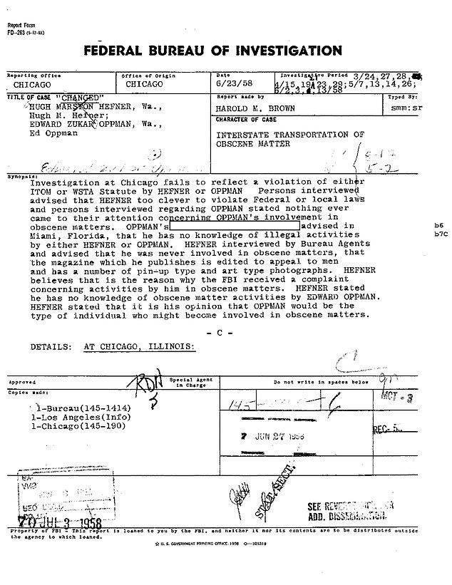 Σε ένα υπόμνημα προς τον διευθυντή του FBI, Τζέι Εντγκαρ Χούβερ, ο υπεύθυνος για τον φάκελο του Χέφνερ ανέφερε ότι ερευνάται εάν ο ιδρυτής του Playboy παραβιάζει τους νόμους. Το ερώτημα ήταν εάν ο Χέφνερ και ο φωτογράφος του Εντουαρντ Οπμαν σκόπευαν να διακινήσουν «πορνογραφικές φωτογραφίες» σε άλλες πολιτείες. Μάλιστα, σε αρκετές από τις σελίδες που απαρτίζουν τον φάκελο, καταγράφονται με λεπτομέρεια οι κινήσεις των δύο ανδρών.