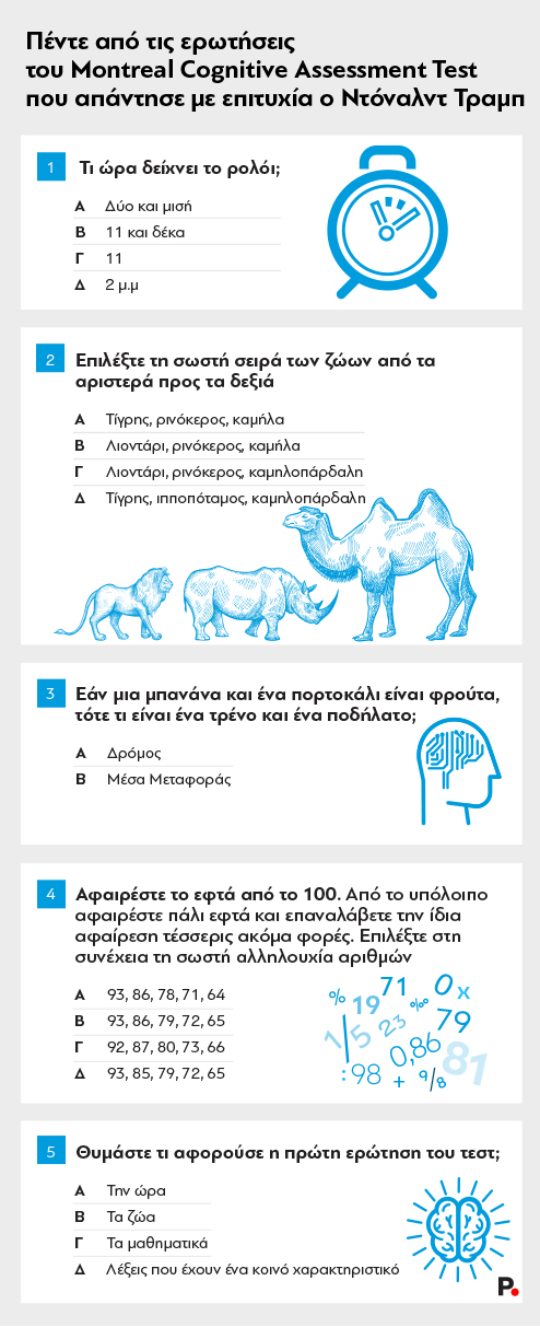Την Τετάρτη, ο δρ. Ρόνι Τζάκσον είπε πως ήταν ο ίδιος ο πρόεδρος αυτός που ζήτησε να υποβληθεί σε ένα τεστ για τον έλεγχο των βασικών γνωστικών του ικανοτήτων. Το ζήτημα, ωστόσο, είναι ο σχετικός βαθμός δυσκολίας της «δοκιμασίας» που ξεπέρασε με απόλυτη επιτυχία ο «ιδιοφυής» Ντόναλντ Τραμπ, απαντώντας σωστά και στις τριάντα ερωτήσεις.