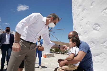Κυριάκος Μητσοτάκης: «Έχει μεγάλο ενδιαφέρον. Καθώς περπατούσα στο νησί είδα την πρώτη μορφή ανανεώσιμων πηγών ενέργειας, τους παλιούς ανεμόμυλους. Και τώρα βλέπουμε τις ΑΠΕ του μέλλοντος: νέες μονάδες ηλιακής και αιολικής ενέργειας που ηλεκτροδοτούν ηλεκτρικά οχήματα. Είναι συναρπαστικό. Και είμαι πολύ χαρούμενος που είστε εδώ».