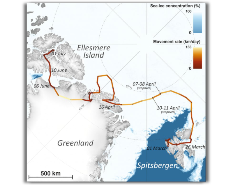 Υπήρχαν όμως και μέρες που διένυε πολύ μεγαλύτερη απόσταση. Όταν βρισκόταν στην βόρεια Γροιλανδία, κάλυψε σε ένα 24ωρο σχεδόν 155 χιλιόμετρα.